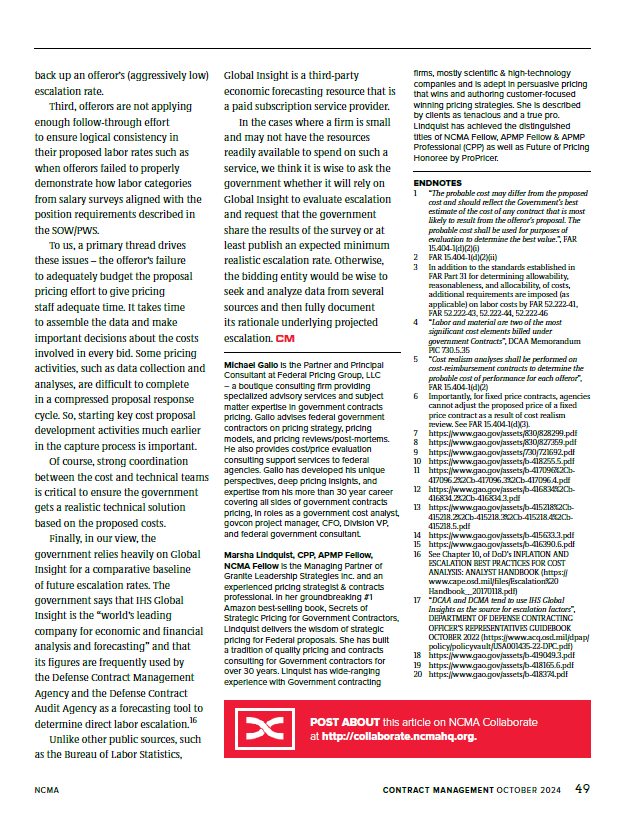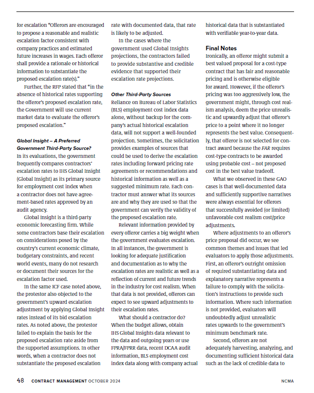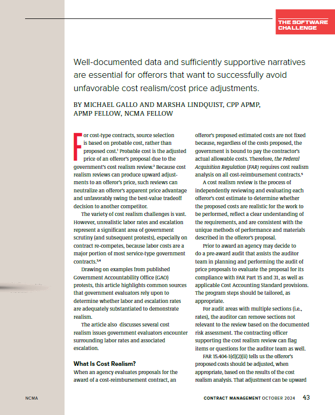 FPG's Mike Gallo collaborated with Marsha Lindquist of Granite Leadership Strategies to present a detailed article covering Cost Realism Issues in the October 2024 issue of NCMA's magazine. The PDF of the article can be downloaded using the button below, and a copy of the article follows as images on the website.