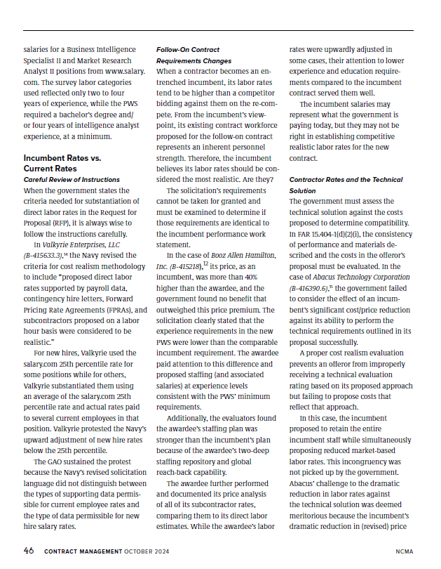 FPG's Mike Gallo collaborated with Marsha Lindquist of Granite Leadership Strategies to present a detailed article covering Cost Realism Issues in the October 2024 issue of NCMA's magazine. The PDF of the article can be downloaded using the button below, and a copy of the article follows as images on the website.